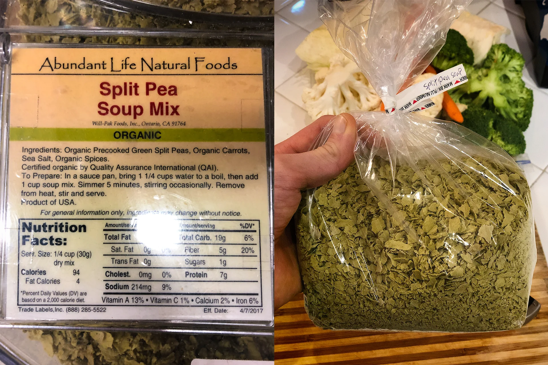 You’ll notice that I used a split pea soup mix which is dry flakes of peas, carrots, salt and spices that I got in the bulk section of my local health food store. If you can find this, it’s a nice shortcut, but it is by no means necessary. It just serves to bulk up the texture and flavor. You can compensate by using more split peas and bouillon/seasoning.