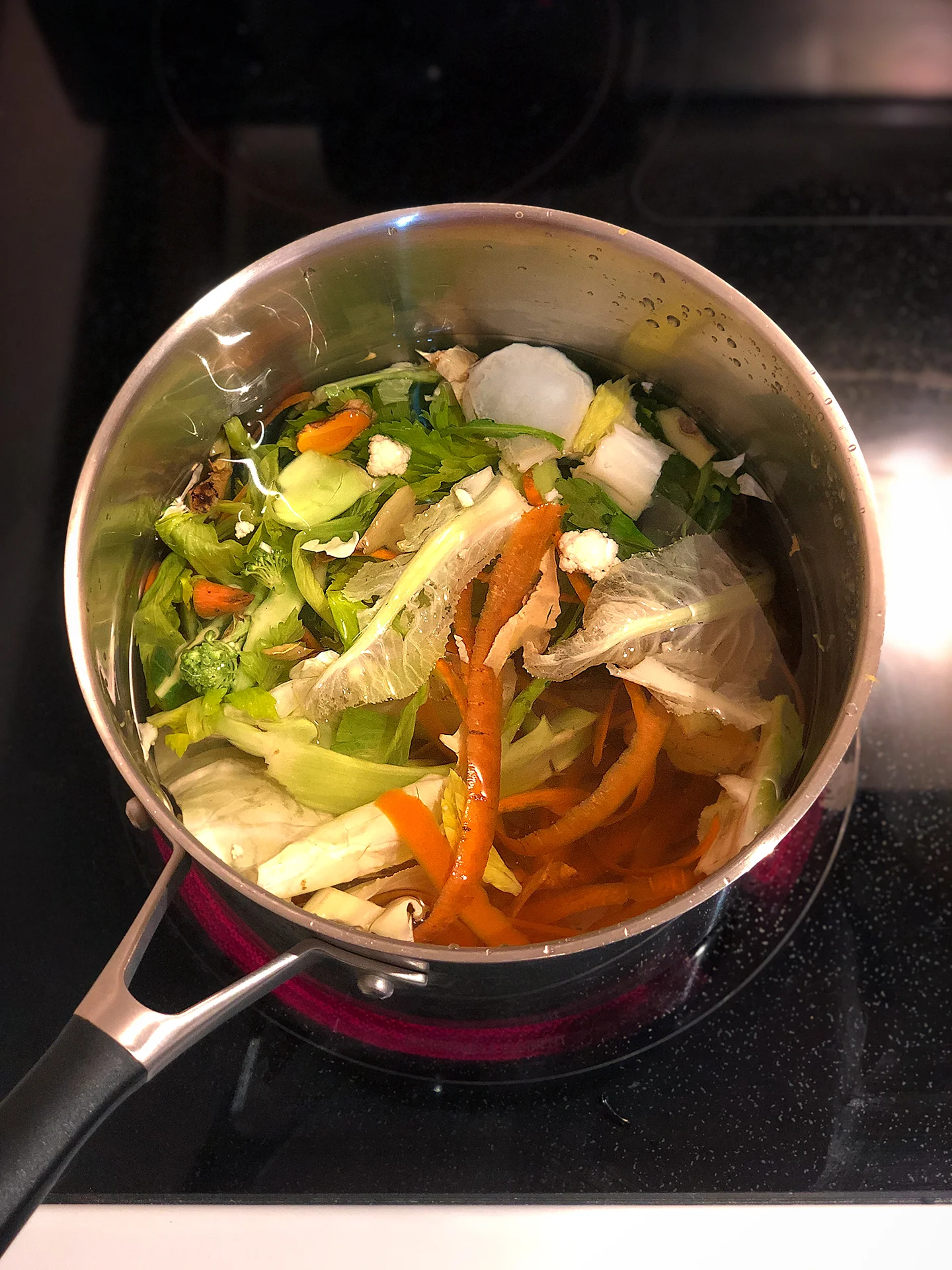 Making veggie broth from off-cuts. Such a great pattern to get into! Now whatever you want to make later that needs cooking liquid, you have it, and it all came from what would have just been compost.
